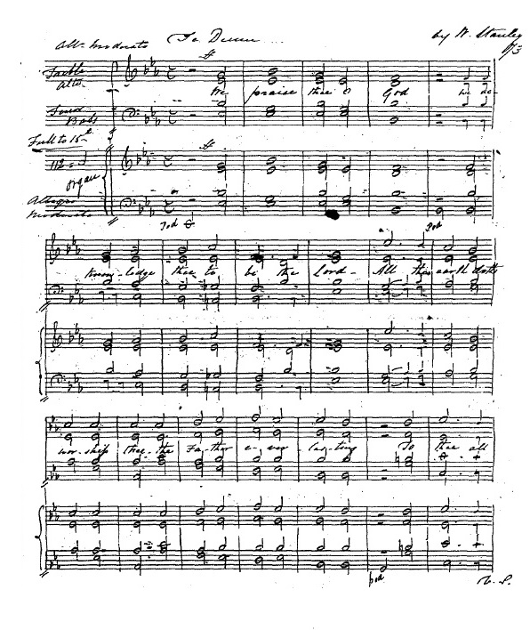Te Deum and Jubilate in E flat (by W. Stanley, '73 [1873]); MS scorebook and partbooks set, Christ Church St. Laurence, Sydney; complete facsimile in Forsyth 2002, 511-27; images above from scorebook, first page of each movement