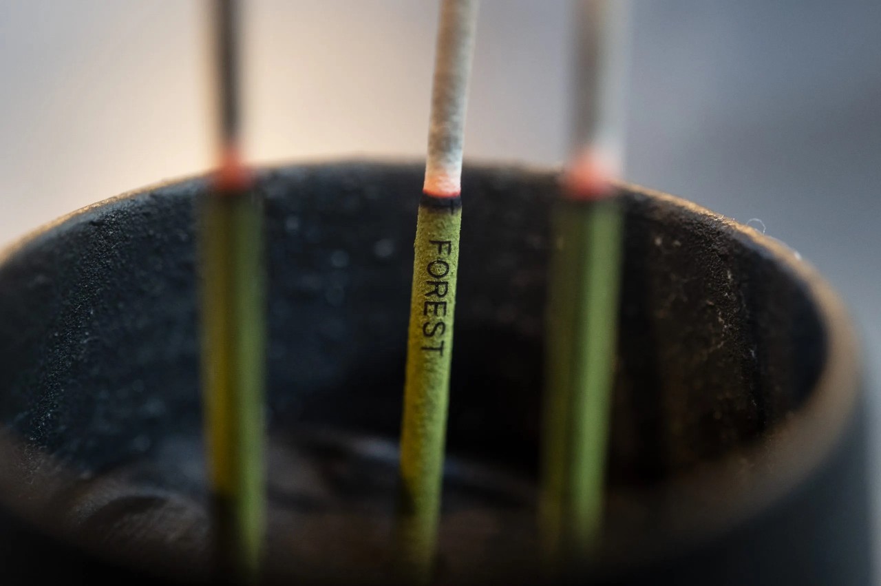 To Burn, Forest, Fire explores the scent of the first-ever forest on earth, and the scent of the last forest of the age of the climate crisis through the creation of bespoke incense sticks. Using scent to explore these forests the artwork employs the senses to cultivate an intimate, intuitive experience that aims to transport participants through time as a reminder of the increasing levels of extinction caused by humanity.