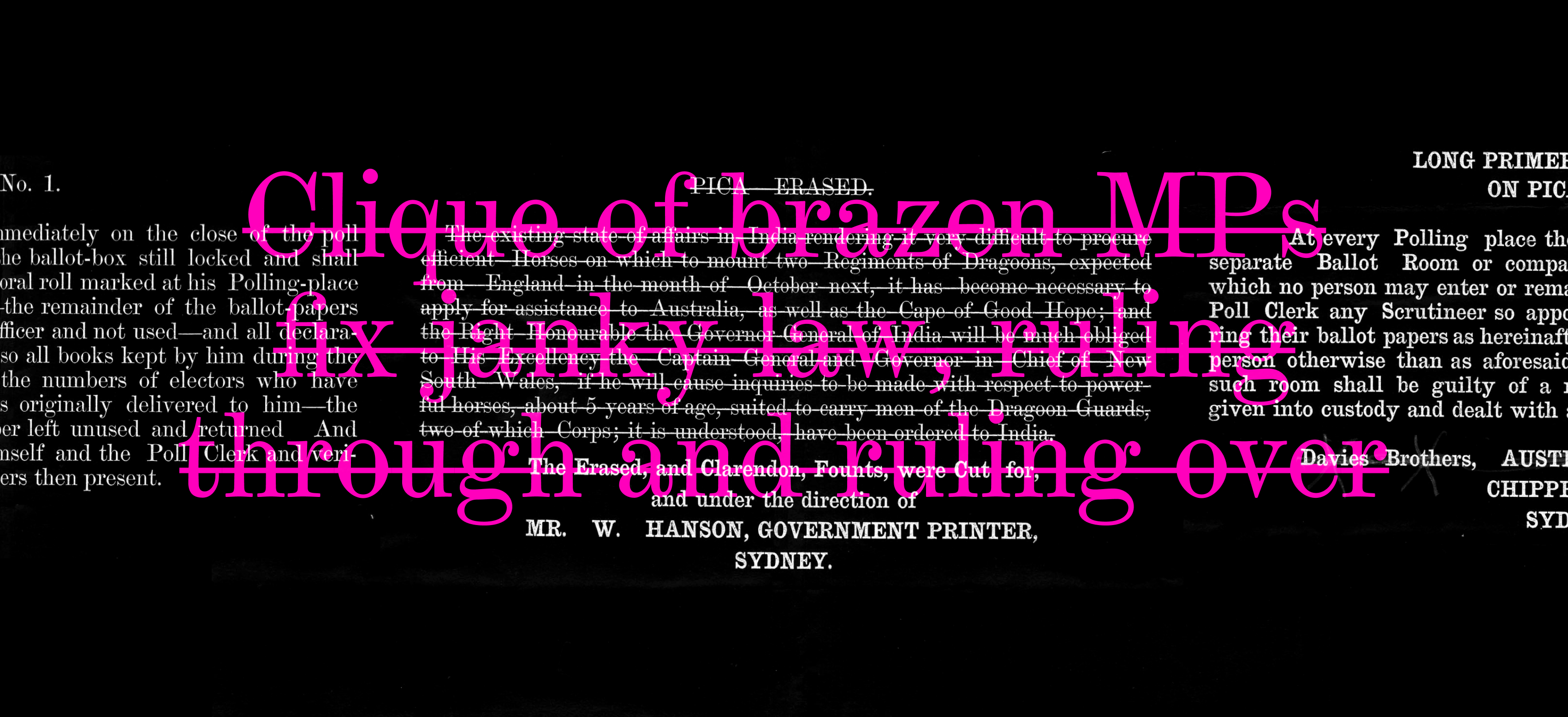 A 168-year-old strikethrough typeface commissioned for printing New South Wales Bill amendments is resurrected, bringing legacies of bureaucratic writing and governmental maintenance into dialogue with contemporary and decolonial applications of the strikethrough. What might be made visible in the space between these two narratives? What forms of new writing might be catalysed using an old typeface?