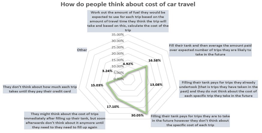 In a recent survey of 772 respondents, participants were asked to think more deeply about transport costs, particularly car trips. In the question, respondents were presented with the arguments of six economists, each suggesting that people calculate the cost of car travel differently. Interestingly, only 4.92 of respondents agreed with the economist who argued that people calculate the marginal cost of the trip and use this to make decisions about car travel. Interestingly, the majority of respondents (78.50%) agreed that people don’t use the marginal cost or even an average proxy cost for each individual car trip (see Figure 1).