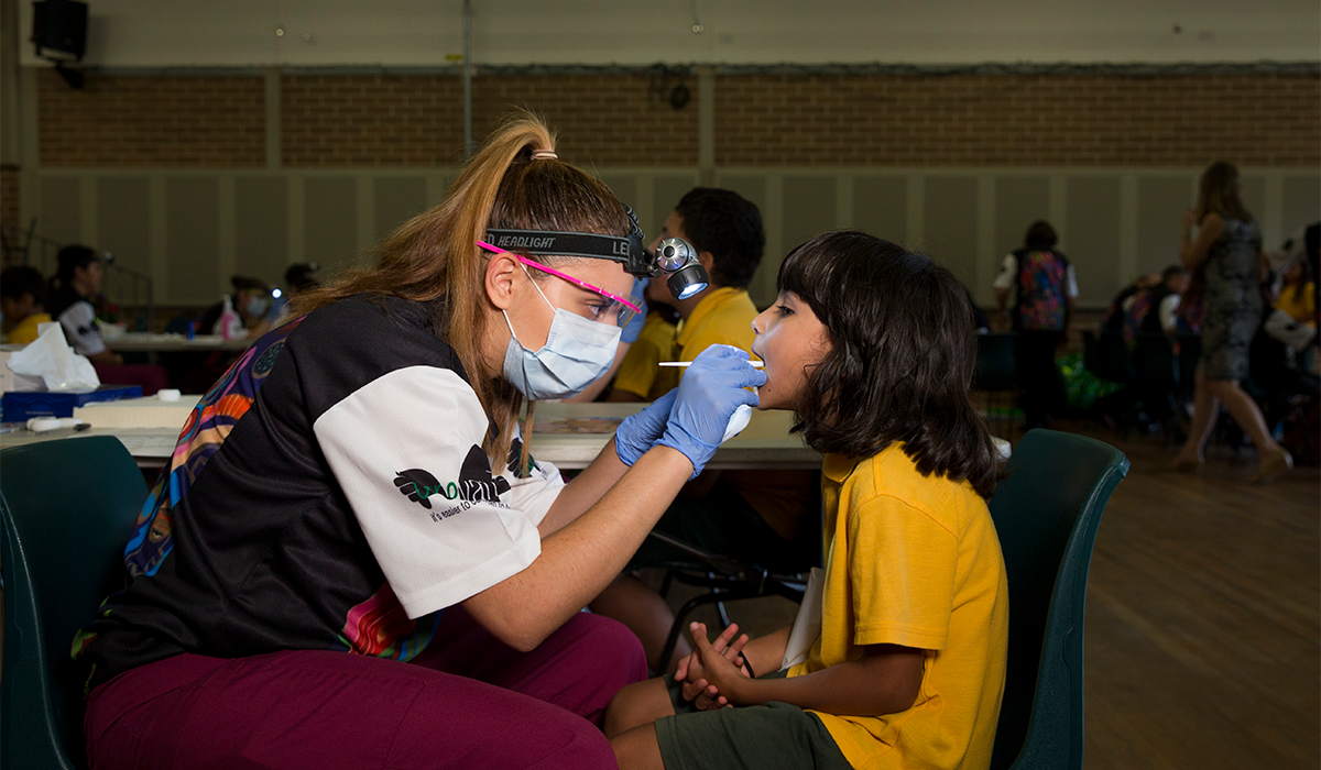 Our Bachelor of Oral Health students provide dental assistance to people who are homeless or at risk of homelessness at the Sydney Homeless Connect event each year. Students dispense vital oral hygiene information and patients are assessed by Sydney Dental School Alumni, who attend with a team in their mobile dental clinic.