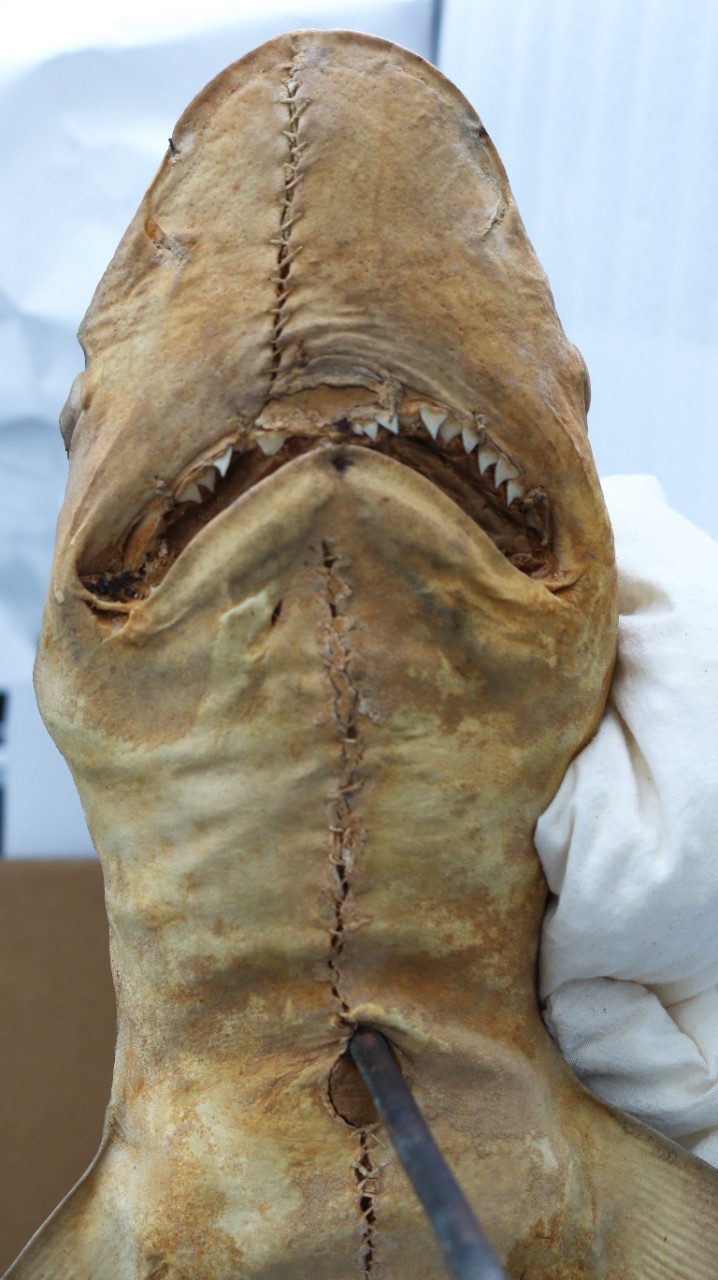 Sasha’s description charts some of the taxidermist’s work, such as stitching and stuffing, and the decisions made to show aspects of the specimen, such as teeth. Macleay’s taxidermist Edward Spalding could not have foreseen the kind of skin shrinkage and movement caused by changing humidity over the next 140 years: one mako shark (pictured top of page) has become more akin to a goofy animated version of itself than the intended representation of the animal ‘in life’. Dr Tony Gill, Curator, Natural History, has suggested the shrinkage causing the fins to bend may have been because the substrate is fin cartilage, which over time has dried and shrunk at a different rate to the skin. This, in conjunction with poor storage, ‘animated’ the shark.
