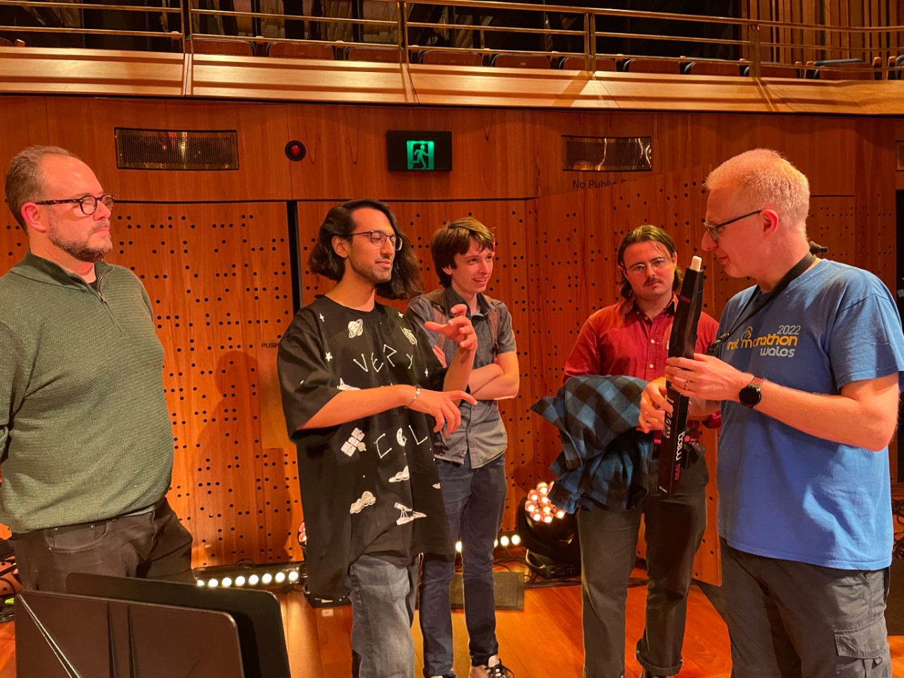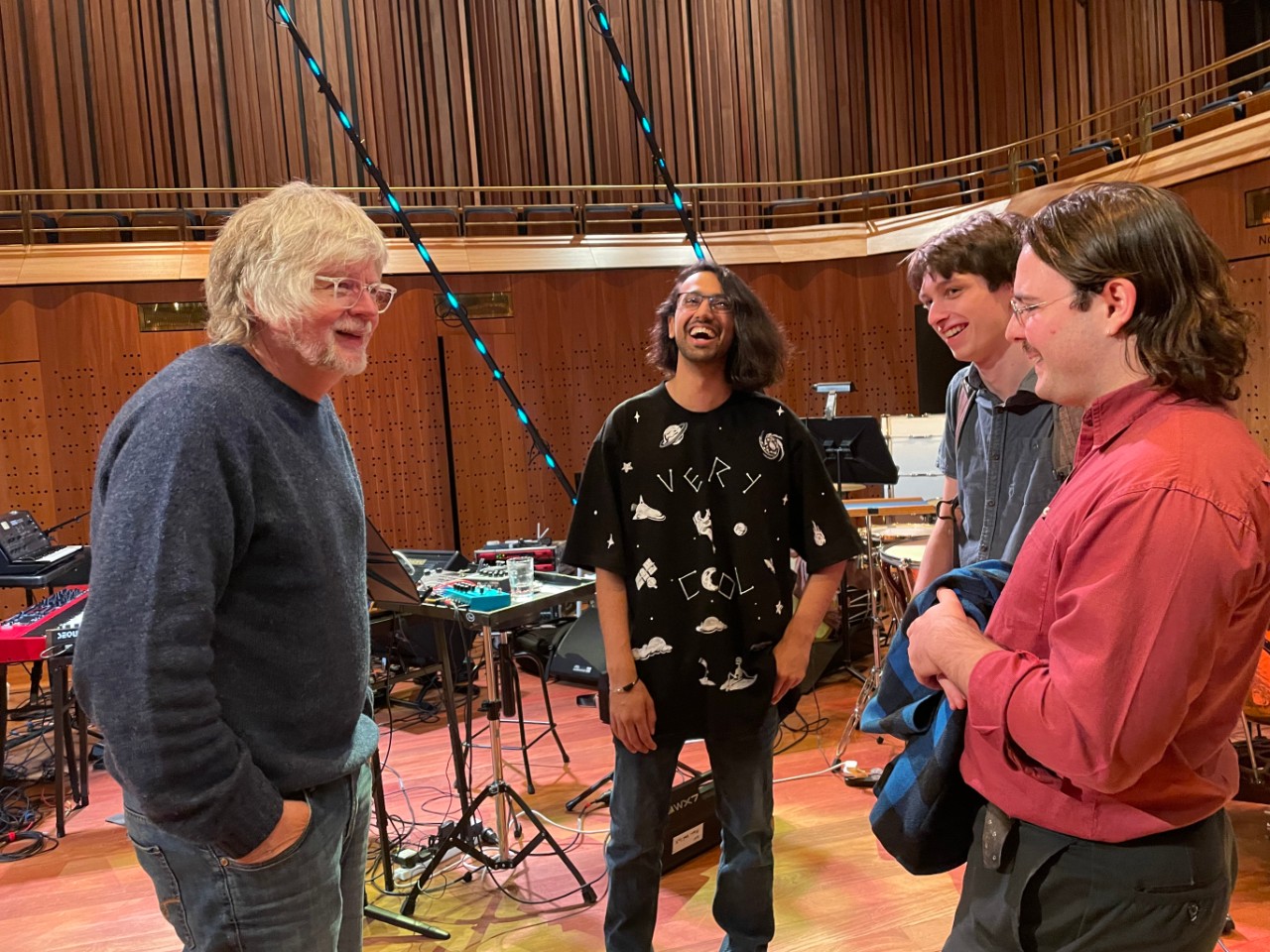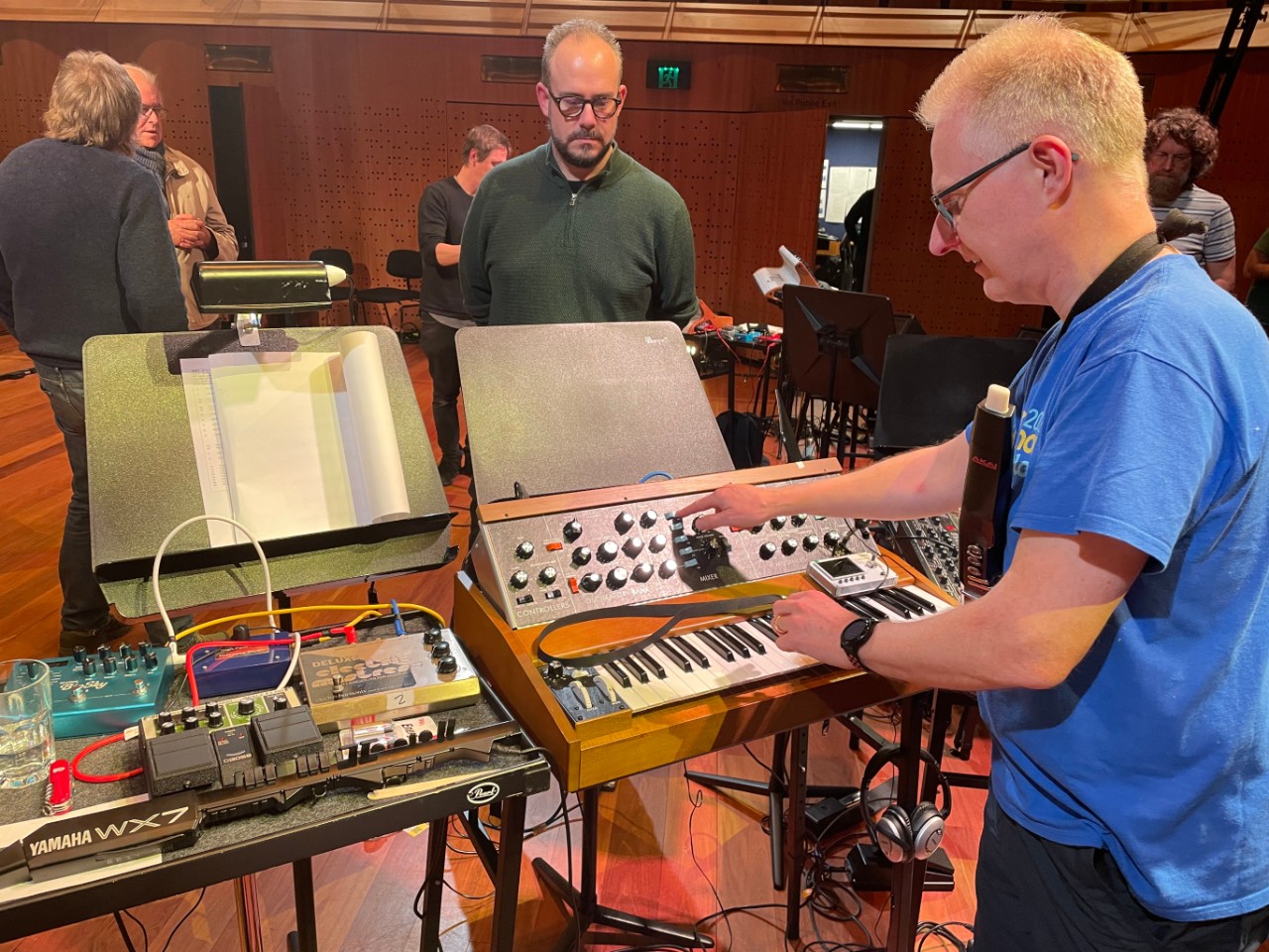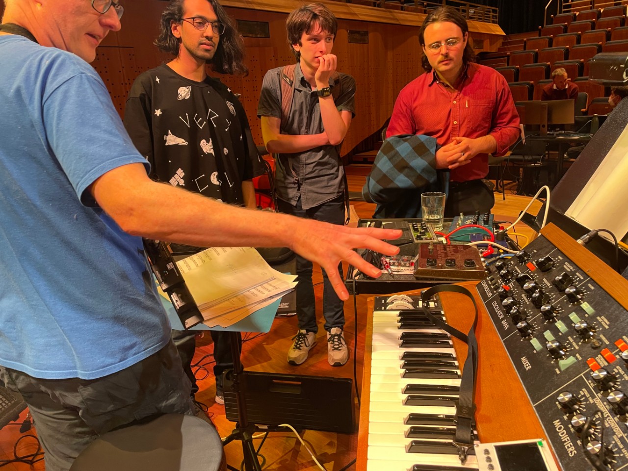 “It was great to bring Nick, Thnvir and Finn from this class to watch this unique open rehearsal, and to meet the musicians,” said Dr Carey. “Wendy Carlos and her work with the Moog had a pivotal influence on electronic music, and to see her legacy celebrated on stage, with these synthesisers blended into a chamber orchestra and played so expressively, was impressive!”