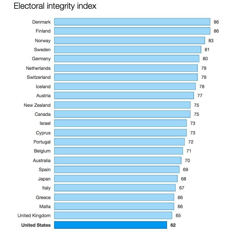 This is no one-time shortcoming. The 2014 US Congressional elections rank even worse, 65th out of 180 worldwide.