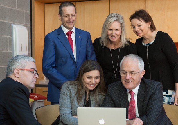 Left to right: Professor Rafael Calvo, Professor Ian Hickie, Dr Laura Ospina Pinillos, Professor Jane Burns, Prime Minister Malcolm Turnbull, Health Minister Sussan Ley.