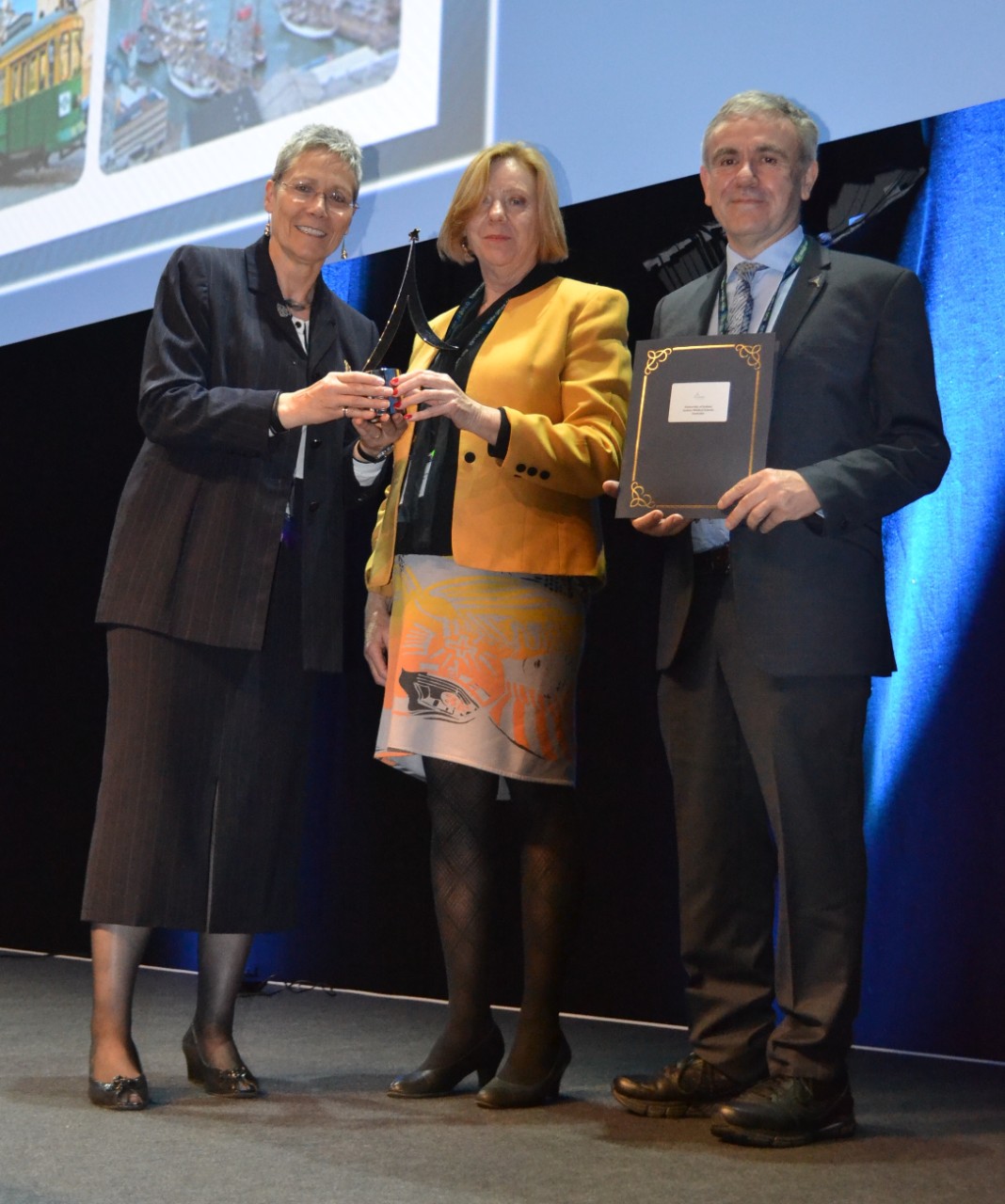 (From L to R) AMEE President Professor Trudie Roberts presents the award to Associate Professor Deborah O'Mara and Associate Professor Chris Roberts from Sydney Medical School.