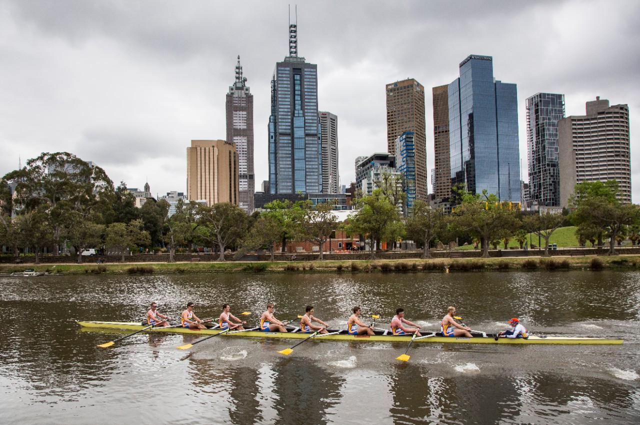 The Australian Boat Race Men’s Eight event, also over 4,200 metres on a winding Yarra River course in the heart of Melbourne, was a spectacular show. SUBC, with flashing yellow oars, started strongly and edged their bow in front. As the river narrowed on one section, the two boats came perilously close together with the bow oar of the Melbourne boat and the blade of Sydney Olympian and number seven rower in the boat, Sasha Belonogoff millimetres from clashing.
