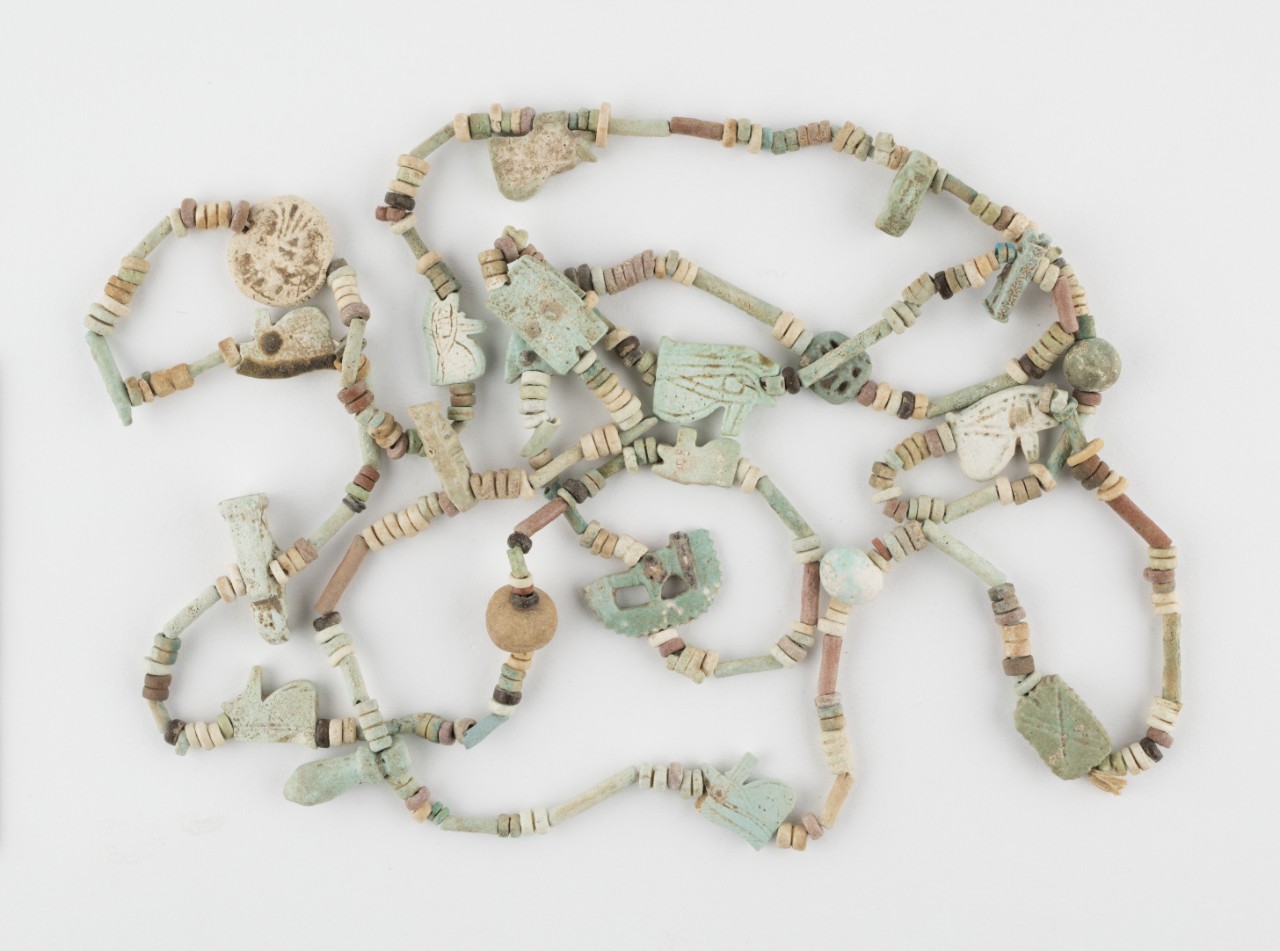 The amulet necklace is made of stone and faience - a material that hardens into bright colours when fired like clay.