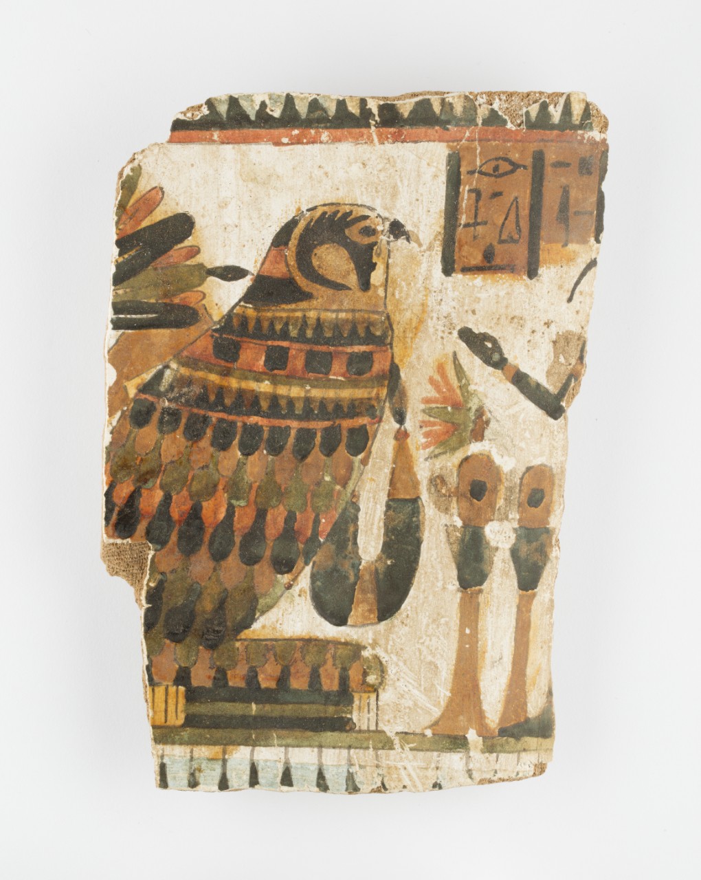 This painted fragment – once part of a coffin or mummy covering – is made of layers of linen and paste.