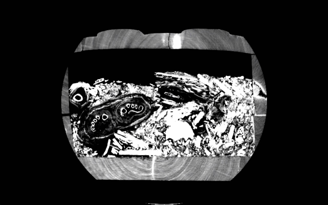 CT-scanning of the coffin at Macquarie Medical Imaging in December brought with it some astounding revelations. The scanner detected two mummified ankles, feet and toes, consistent with a single person, and had fused bone endings which suggested the person was an adult when they died.