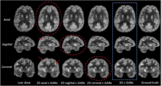 Qualitative comparison between estimated results by 2D c-GANs and 3D c-GANs. In the axial and coronal images, the left side of the image is the right side of the brain, and the right side of the image is the left side of the brain. Image courtesy: NeuroImage.