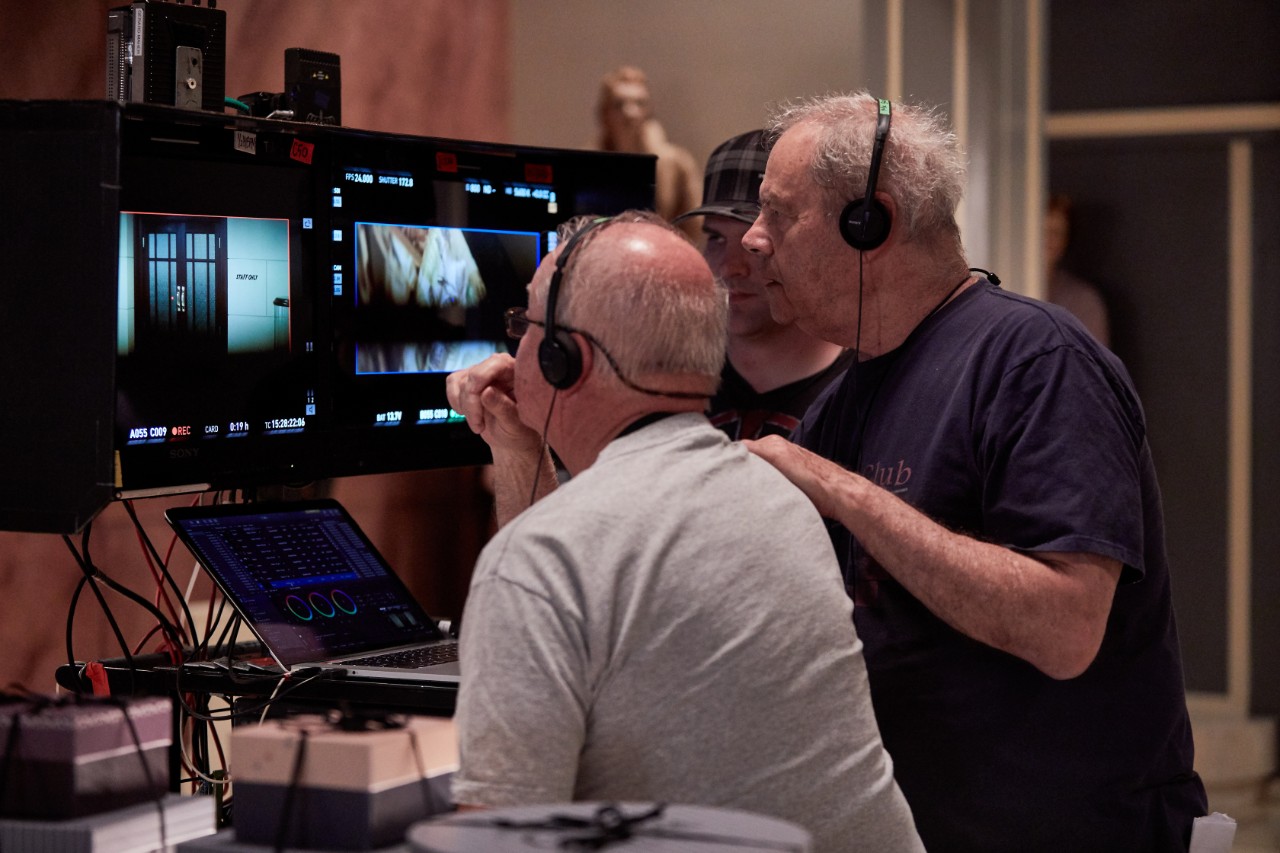Beresford (R), discusses shots with cinematographer, Peter James.