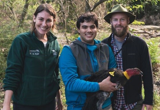 The brush turkey research team, led by Sydney doctoral candidate Matthew Hall (centre) with Taronga's Dr Alicia Burns and Dr John Martin from the Royal Botanic Garden.
