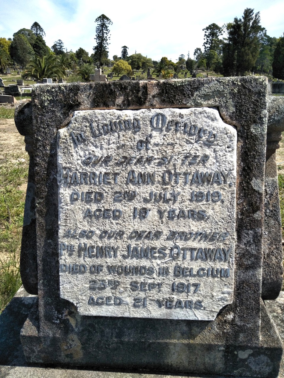 The grave contains the remains of 19-year-old Harriet Ann Ottaway, who died on 2 July 1919. Its monument also commemorates her brother Henry James Ottaway, who ‘died of wounds in Belgium, 23rd Sept 1917, aged 21 years’.