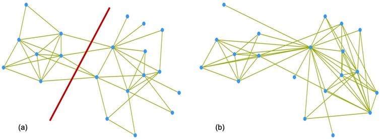 The company’s management thought team-building might help bring the subgroups together, and asked us to help. Scenario (b) shows the team three months later. There were more connections within the group, with one individual particularly pivotal in unifying the team.