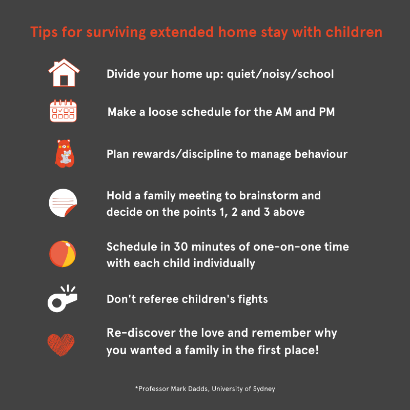 Extended time together in the house can lead to bored children, getting on each other’s nerves, escalating conflict, and serious challenges to our sanity! Here are some practical tips for surviving from Professor Mark Dadds, from the School of Psychology, in the Faculty of Science. They are targeted at parents of primary school age children, but the same principles apply to children of any age.