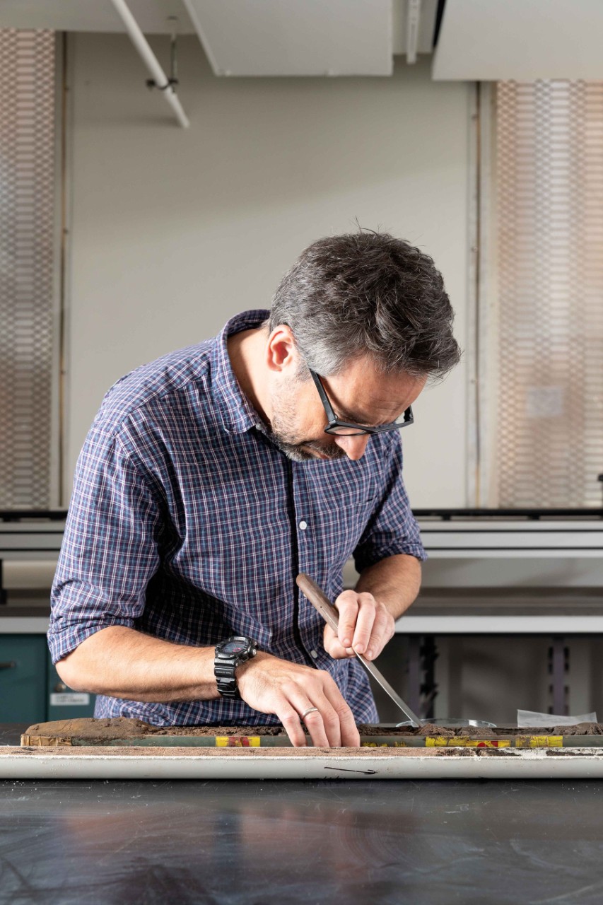 Dr Dan Penny with core samples, in the Geosciences Marine Wet Sediment & Core Analysis Laboratory.