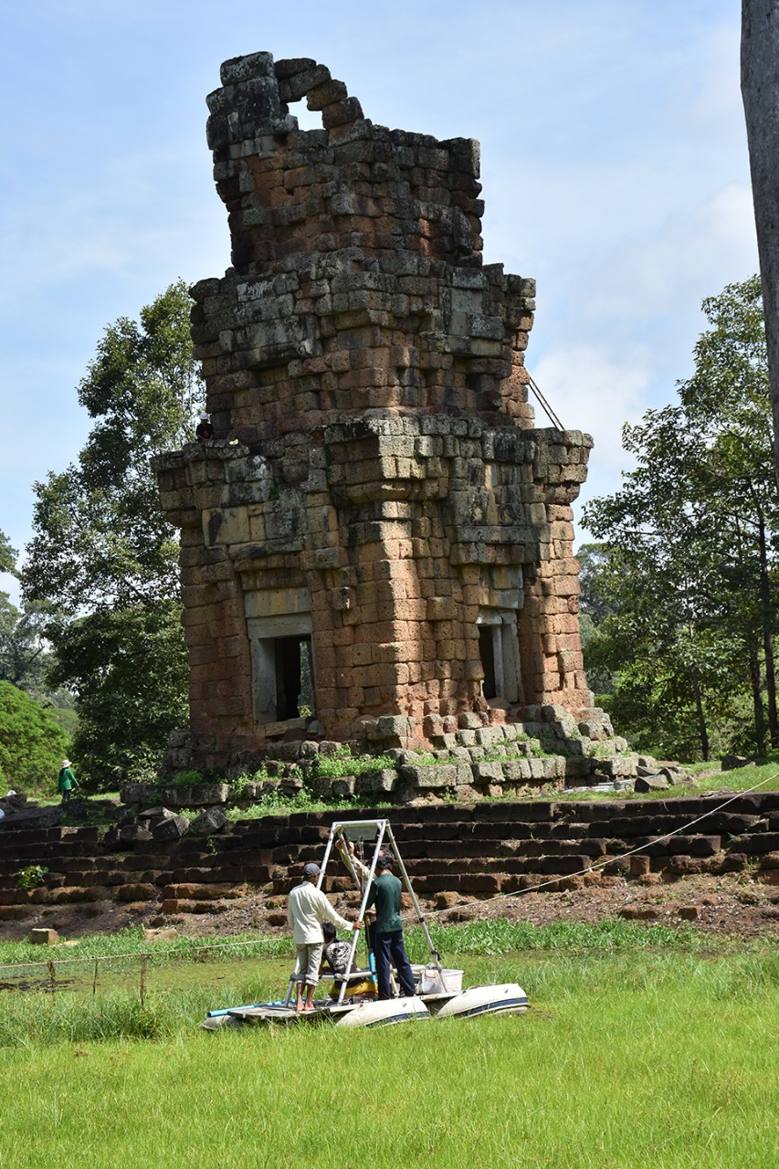 On a floating platform, Penny and team take a drill core sample from an overgrown reservoir. The 12th century tower S1, of the Prasat Suor Prat group, looms in the background.
