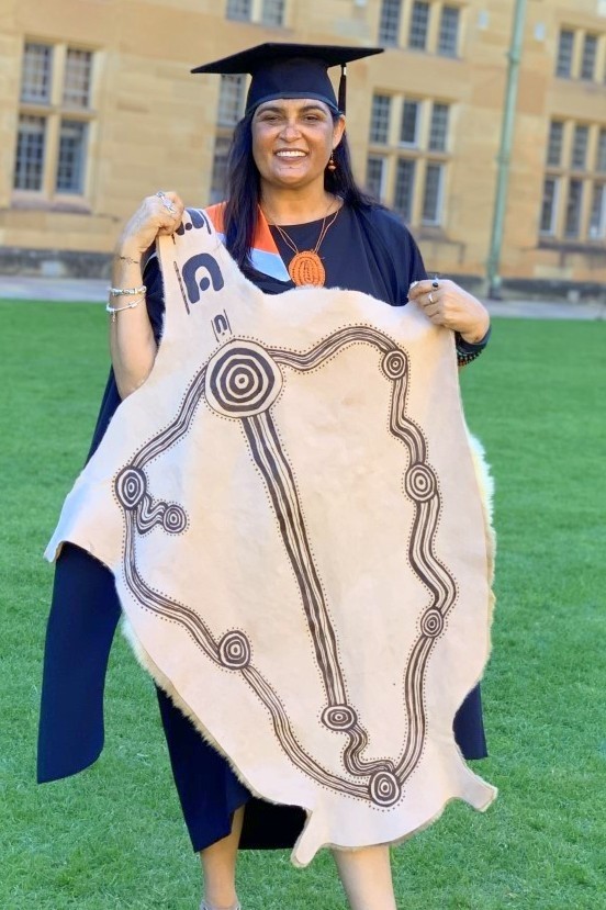 Kelli Owen on graduation, with the wanggami wankandi (kangaroo skin), she decorated to symbolically represent her educational journey.