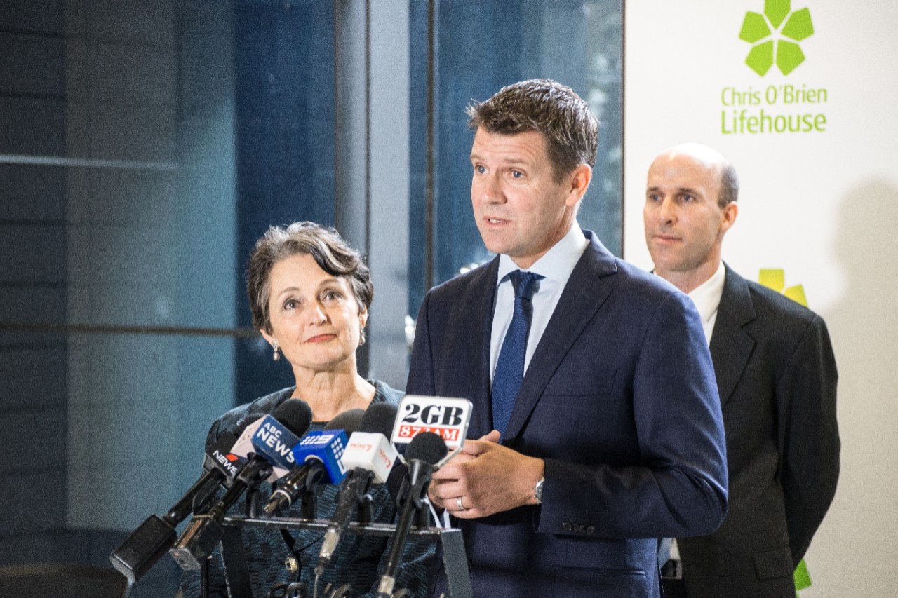 Former NSW Premier Mike Baird, Assistant Health Minister Pru Goward and Associate Professor Peter Grimison at the trial's announcement in 2016.