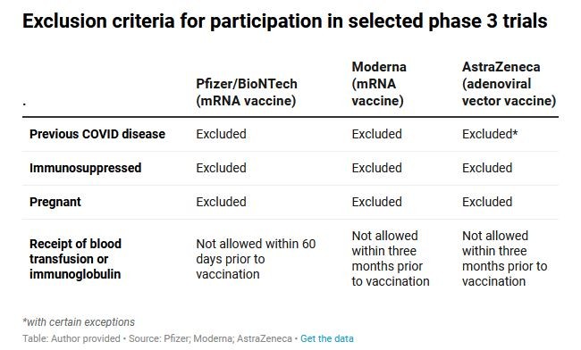 The phase 3 protocols for the Pfizer, Moderna, and AstraZeneca vaccines all have similar exclusion criteria, as you can see in this table.