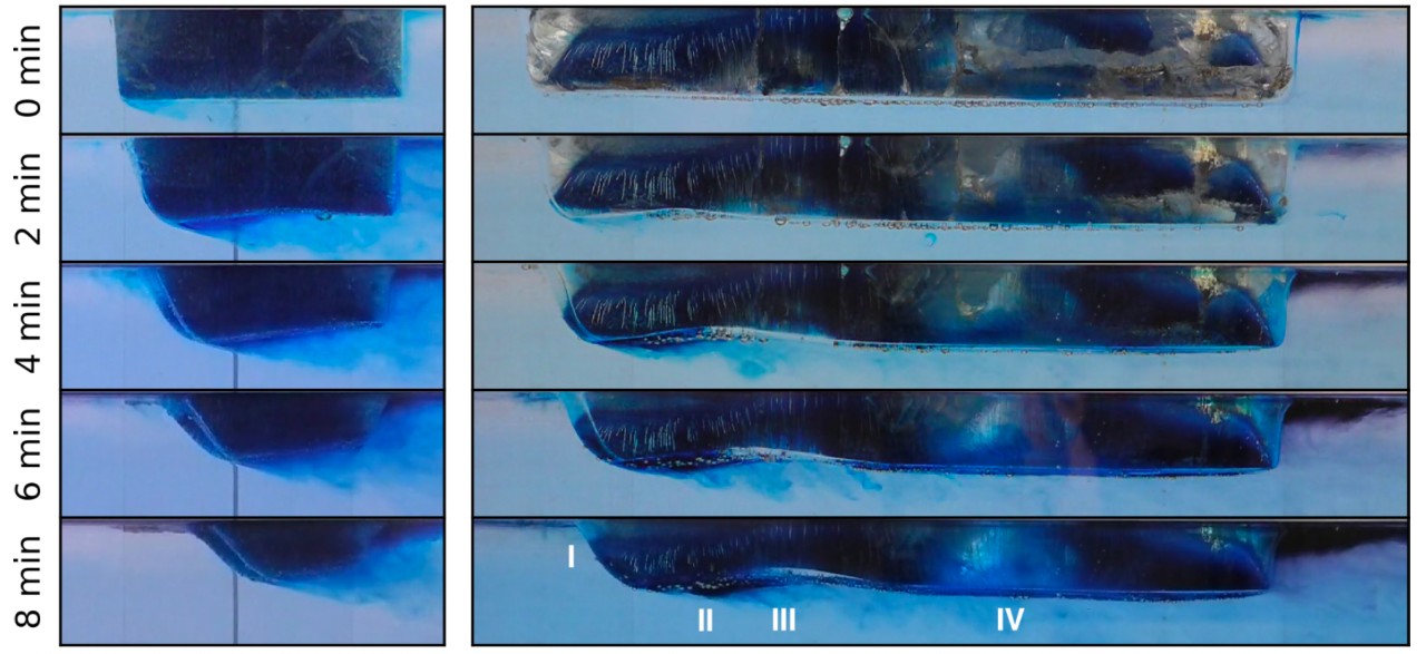 Experimental iceberg melt over eight minutes clearly shows uneven melt.