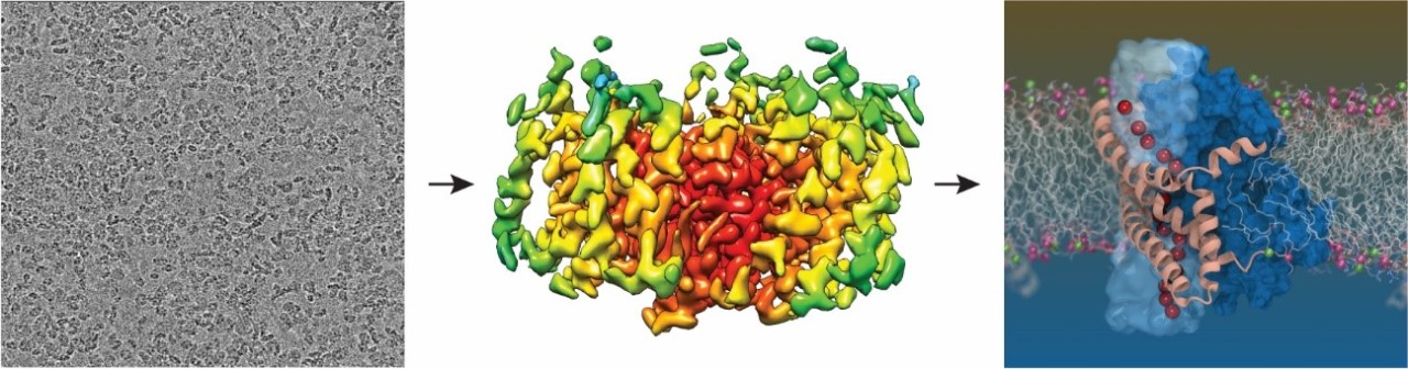 Individual transporter particles captured by the cryo-EM (left), the structure solved by averaging thousands of these individual particles (middle) and a computer simulation of the glutamate transporter in a lipid membrane revealing the pathway for chloride ions (red) Right image credit: Shashank Pant, University of Illinois at Urbana-Champaign.