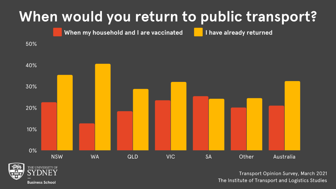 Our survey findings strengthen the general perception that a return to public transport will be contingent on a successful vaccination program.