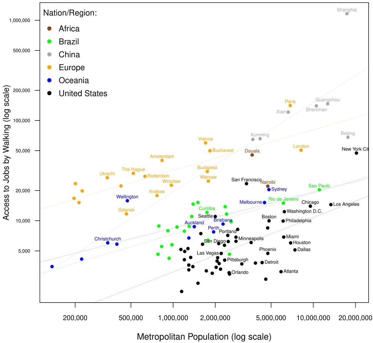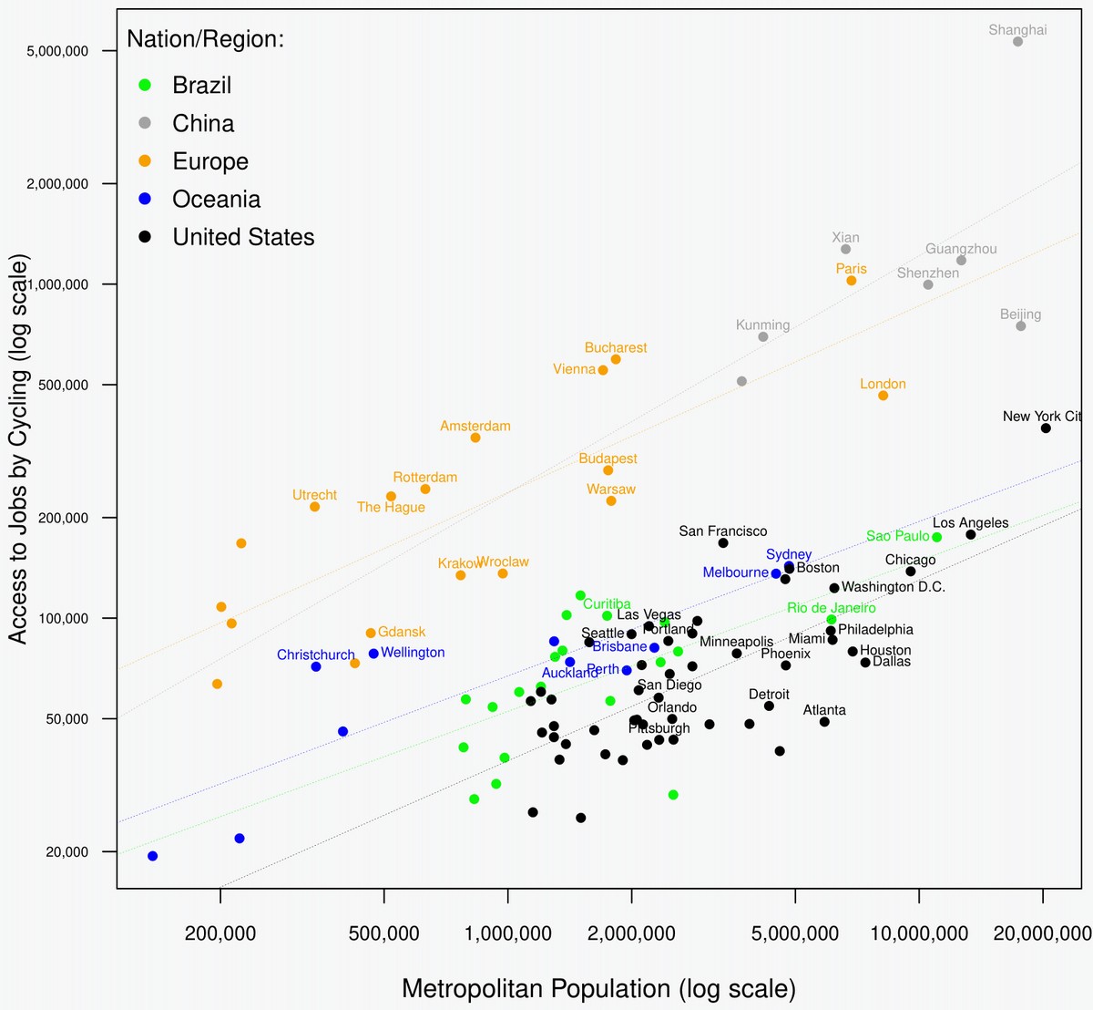 Number of jobs accessible within 30 minutes’ cycling plotted against population for global cities. Credit: Professor David Levinson, Dr Hao Wu