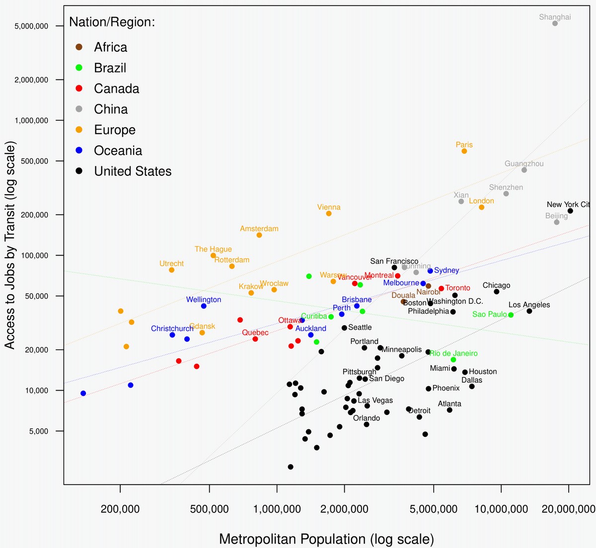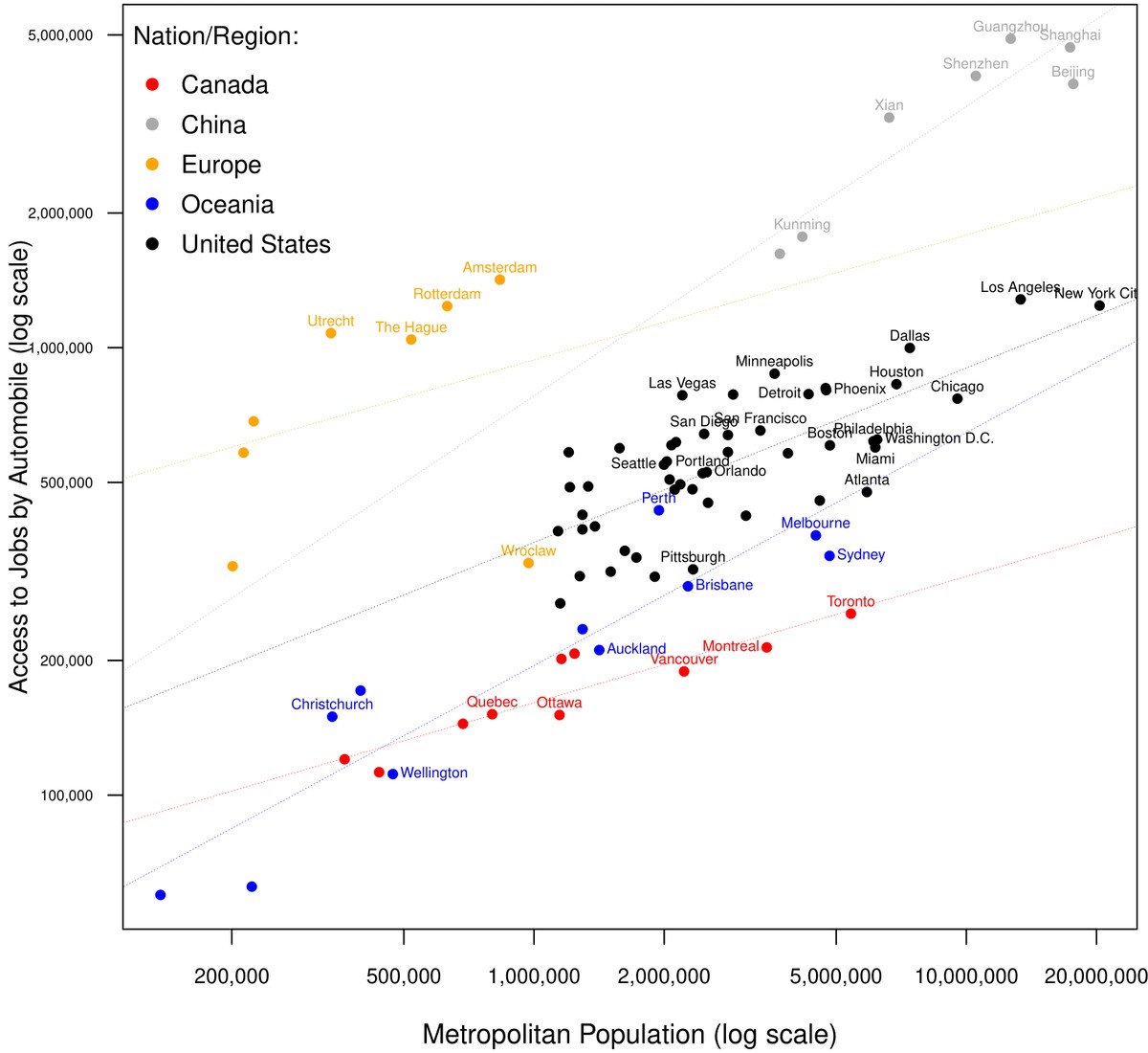 Number of jobs accessible within 30 minutes by car plotted against population for global cities. Credit: Professor David Levinson, Dr Hao Wu.