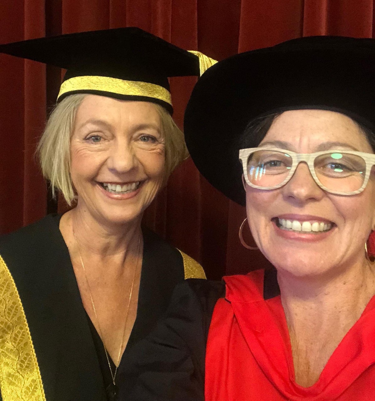 Professor Marian Baird and Professor Rae Cooper at a graduation ceremony in academic gowns.