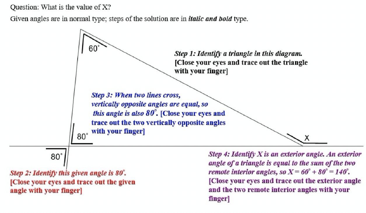 In the first study, published in Educational Psychology Review, 93 Year 4 and 5 students from a school in Shanghai, China were being taught about the properties of angles in a triangle. They were randomly assigned to the control condition, the tracing condition, or the tracing/imagination condition, and then given ‘calculate the missing angle’ examples to complete under practice and test conditions.