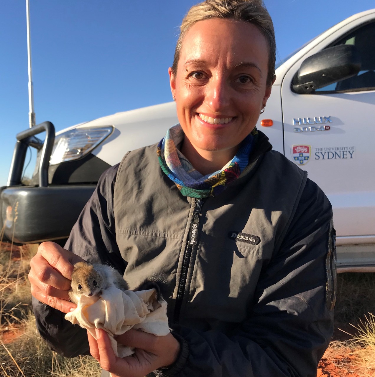 Dr Ayesha Tulloch in the Pilungha Reserve, Simpson Desert, holding a crest-tailed mulgara Dasycercus cristicauda.