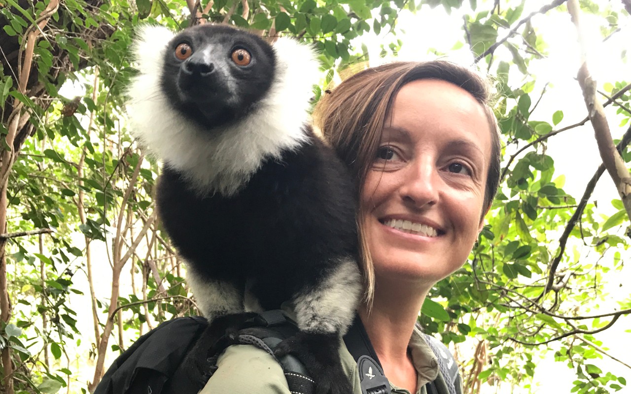 Dr Ayesha Tulloch in Madagascar with a friendly black-and-white ruffed lemur Varecia variegata. Dr Tulloch has been recognised for her nature conservation work.