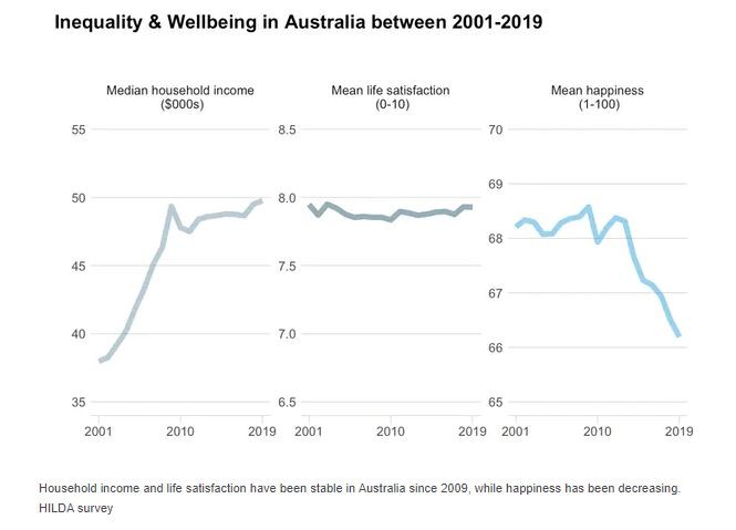 Our work shows someone living in the average Australian household earning A$50,000 in 2001 and the equivalent amount in 2019 (adjusted for inflation) has become much less happy over the past two decades.
