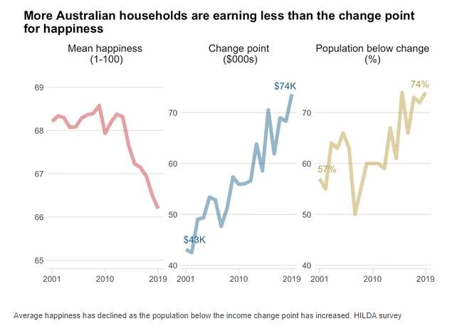 The change point at which the happiness of most Australians no longer strongly depends on income has almost doubled from A$43,000 to A$74,000.