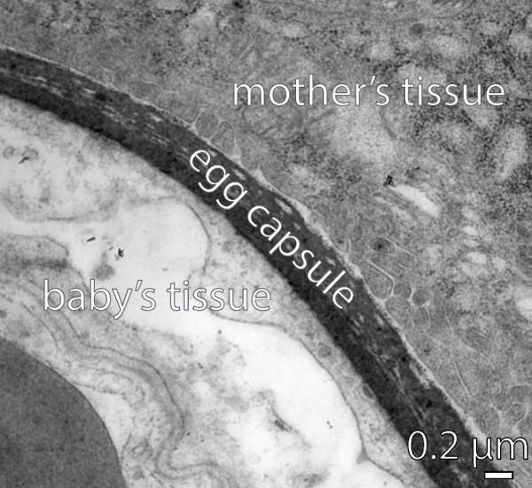 The egg capsule in the sharpnose placenta has no pores. But we showed it can still allow small molecules to pass from the mother to her babies, such as oxygen and small nutrients including sugars, amino acids, fatty acids and water. This explains how sharpnose babies can grow so quickly inside the mother’s uterus.