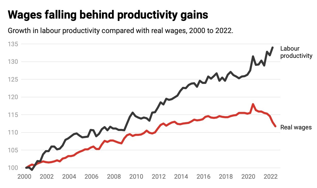 Business leaders like to insist wage increases aren’t possible without productivity growth. But the actual problem for the past decade has been the opposite: productivity grew while real wages stagnated – and are now falling rapidly due to the surge in inflation.