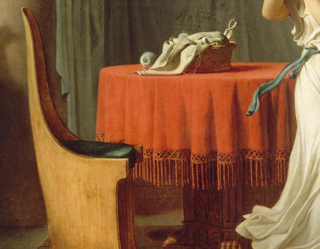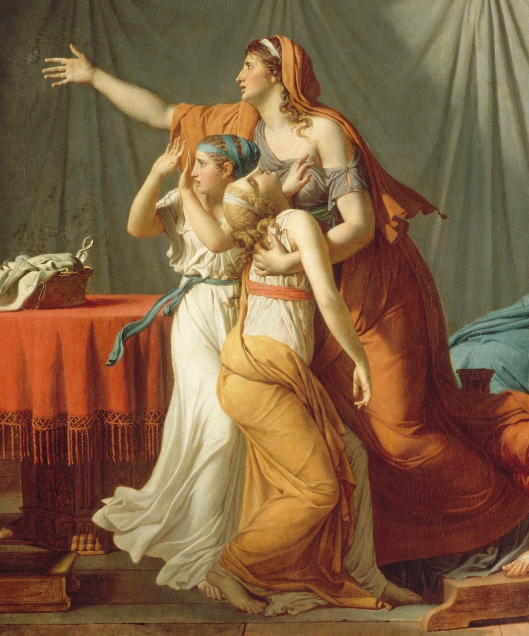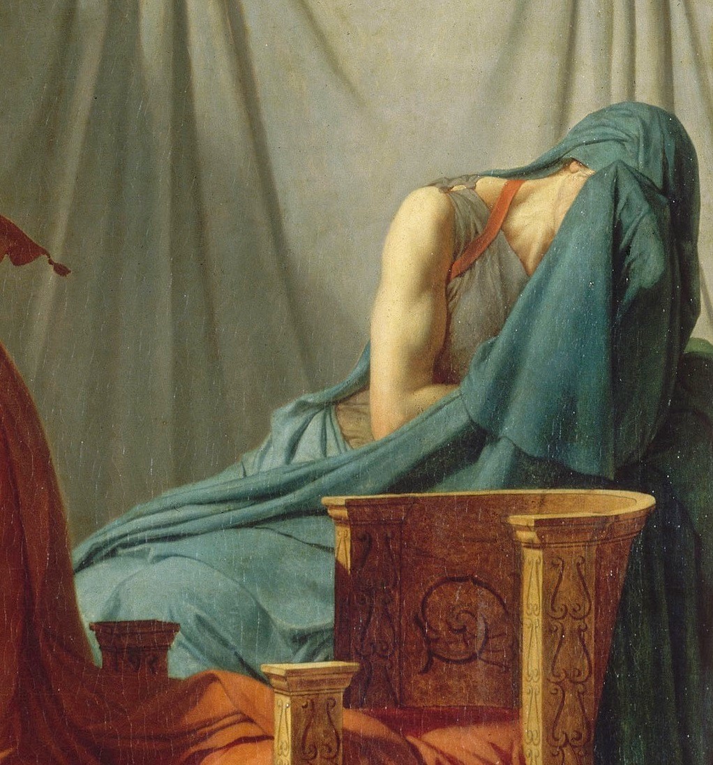At the right edge of the painting sits another figure, a veiled servant, whose face David hides, perhaps echoing Timanthes’ depiction of the grieving Agamemnon. Her tense muscles and veins hint at grief and despair.