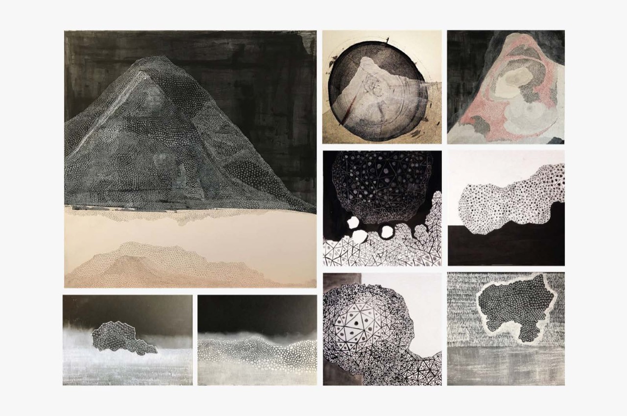 A selection of works from Karin Einav Perez’s ‘Everything Connects’ series. The top left image, Like a Rock (2014), inspired the granular science conducted in this paper.