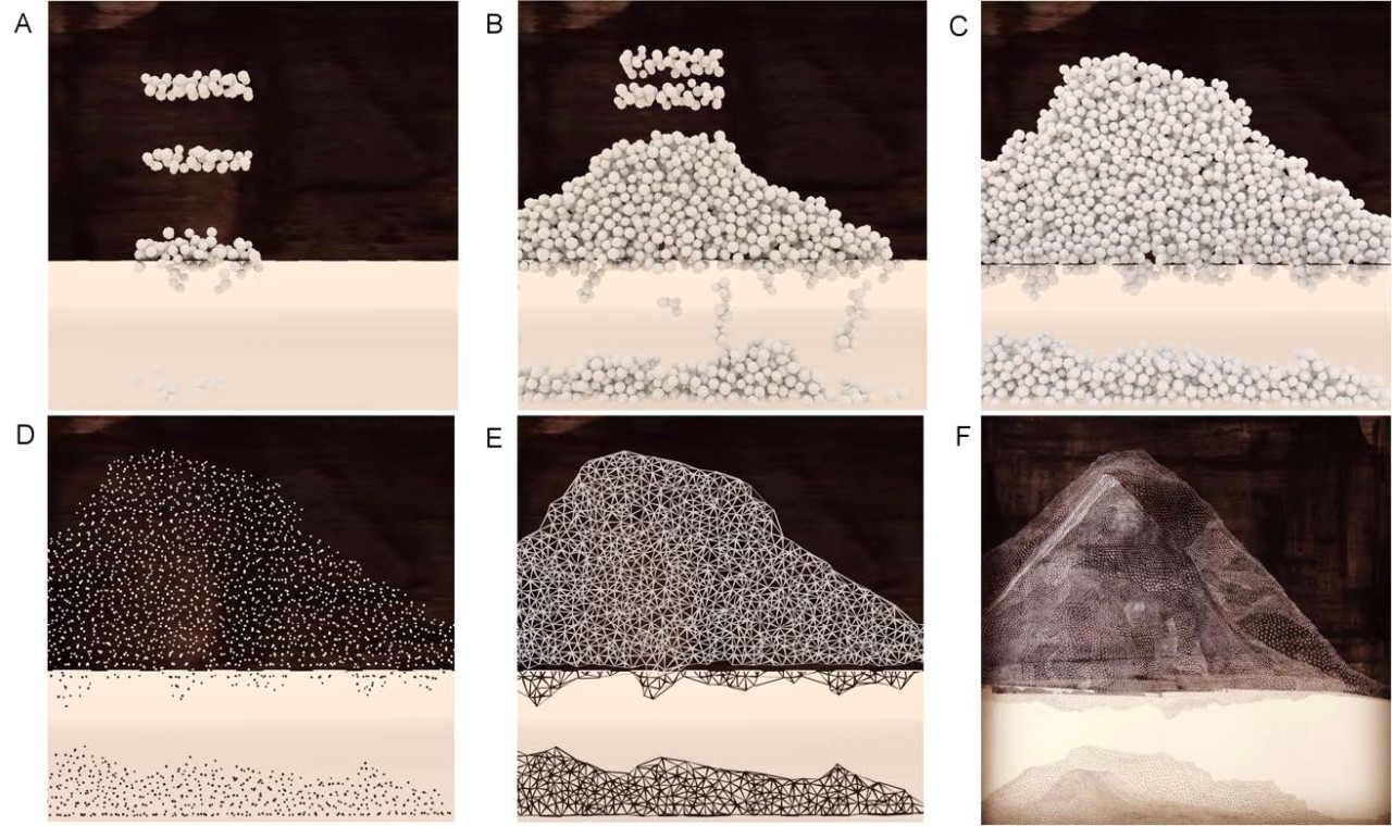 “To make the leap from art to science, we recreated the artwork by simulating our imagined particulate system using a physics-based computational model of granular systems, allowing us to quantitatively analyse stalactite structures,” said Mr Benjamin Leithon, anhonours graduate student who carried out the simulations.