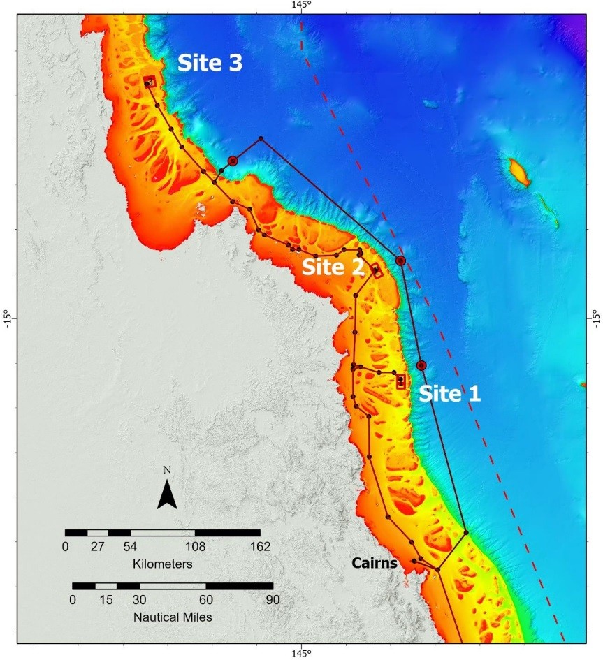 Map of Queensland coast showing survey sites, Ribbon Reef (1), Cormorant Reef (2), Tijou Reef (3) [Credit: CSIRO].