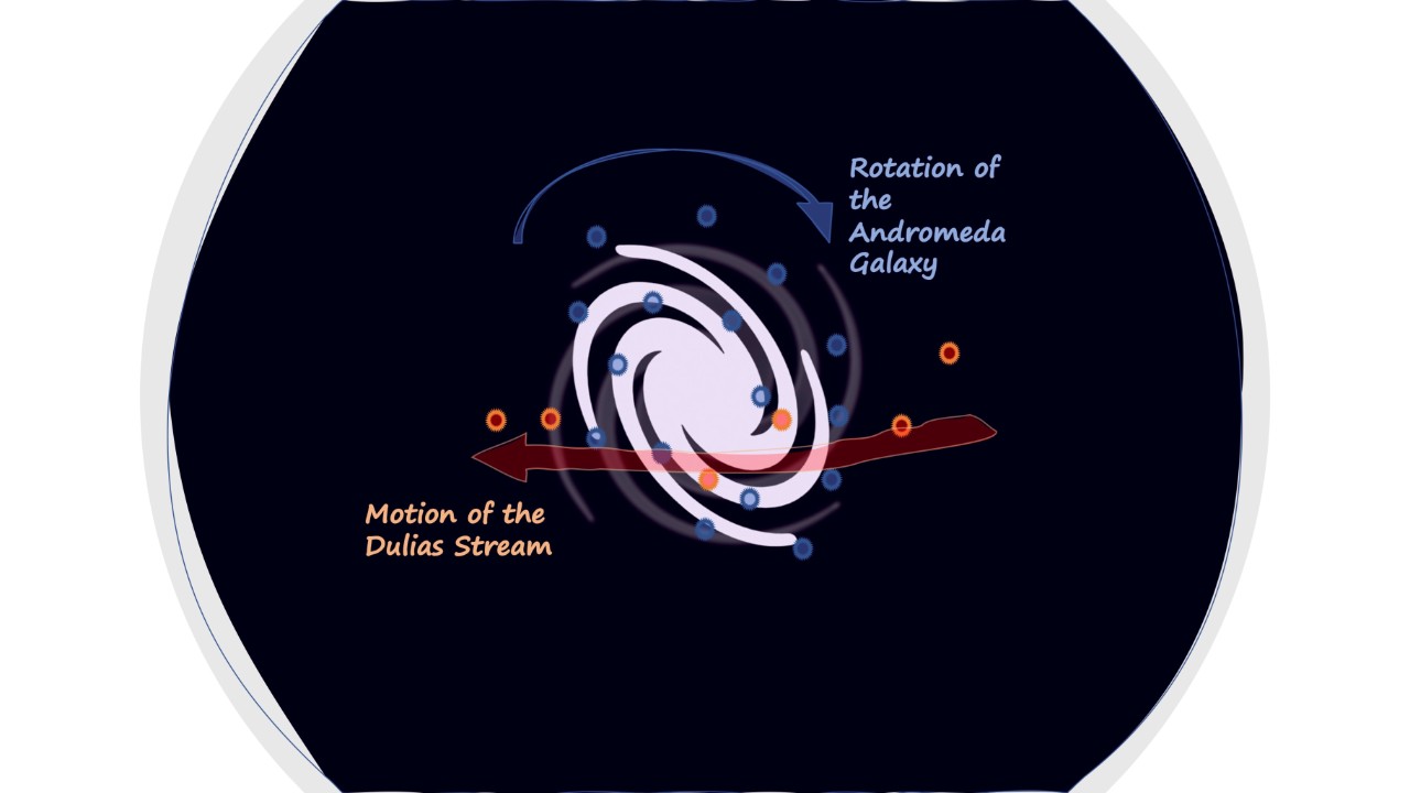 The Dulais Structure represents the leftovers of a colossal feeding event in the ‘recent’ past, a dark stream lit up by star clusters orbiting unlike any others in Andromeda. It provides evidence that galaxies grow by ‘eating’ smaller systems, and the findings are at odds with a more sedate picture of galactic growth.