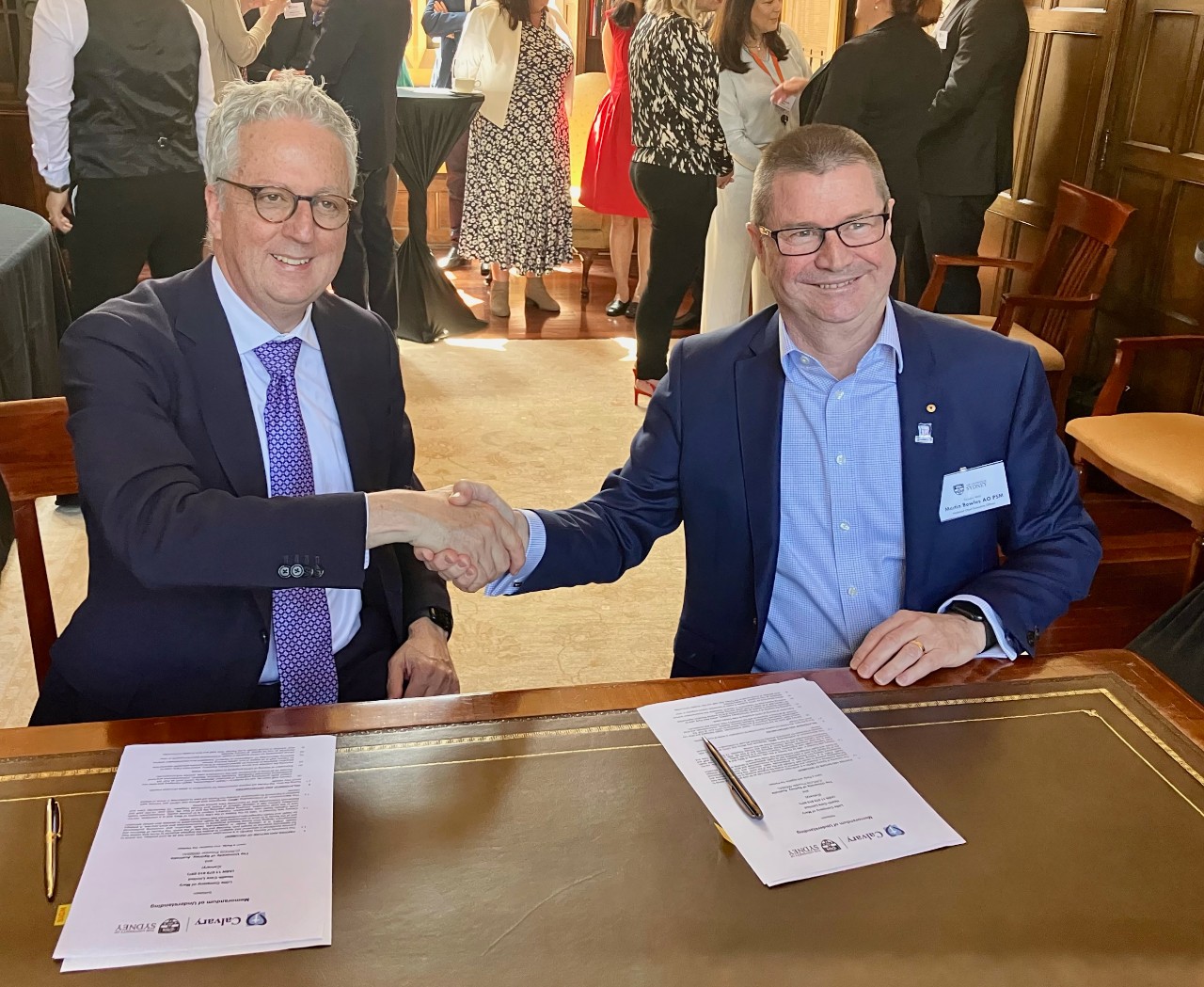 Vice-Chancellor and President Professor Mark Scott AO and Calvary CEO Martin Bowles AO PSM sign the MoU at a ceremony at the University of Sydney.