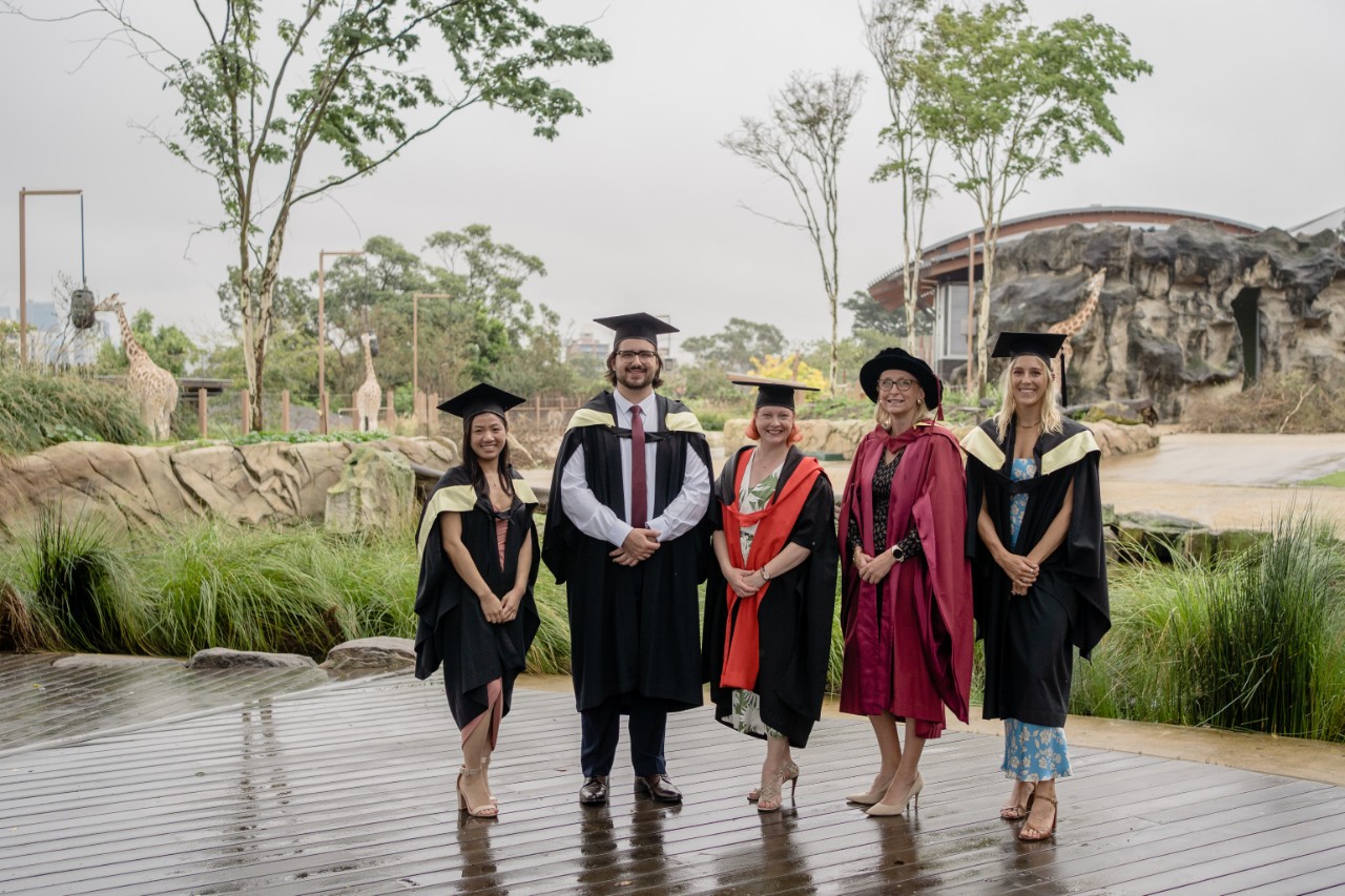 The first cohort of graduates from the Bachelor of Science and Bachelor of Advanced Studies (Taronga Wildlife Conservation), with staff (l-r): Jessica Lu, Patrick Lopez, Dr Emma Thompson, Associate Professor Cathy Herbert, Eliza McEwan.