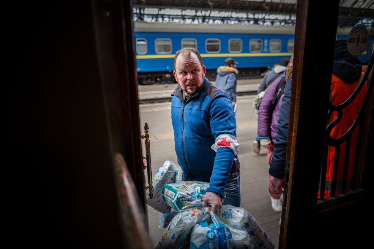 Volunteer medics or paramedics help thousands of refugees fleeing war-torn territories to Europe at Lviv Railway Station. Photo: Shutterstock