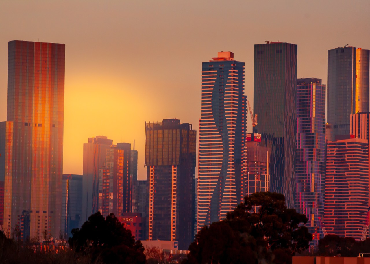 The sun glowing over the Melbourne skyline. Photo: Adobe Stock.