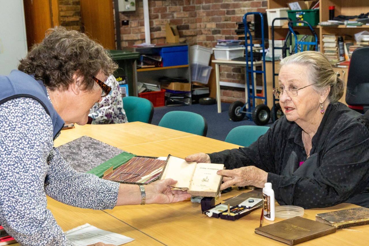 Janet Oakley and Lydia Bushell discuss the French translation of a donated book. Volunteers restore older books and search out their provenance prior to sale.