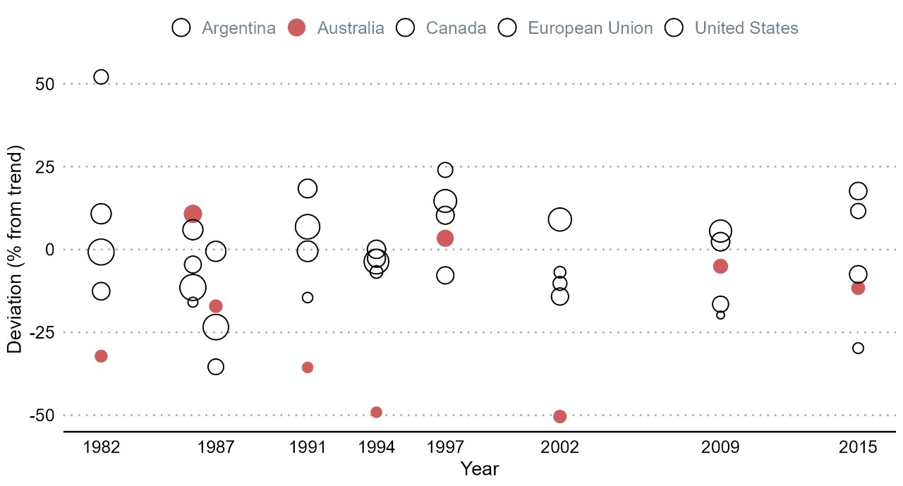 The next graph compares changes in Australia’s wheat production with other significant wheat exporters in El Niño years. Dips in Australia’s production tend to be offset by changes elsewhere.