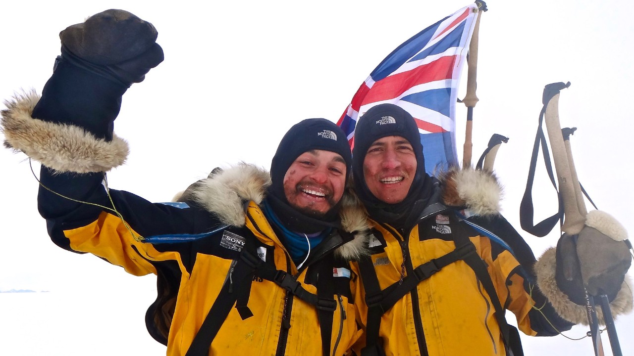 James Castrission and his expedition partner Justin Jones at the end of their world record-breaking unsupported expedition from Antarctica to the South Pole and back.
